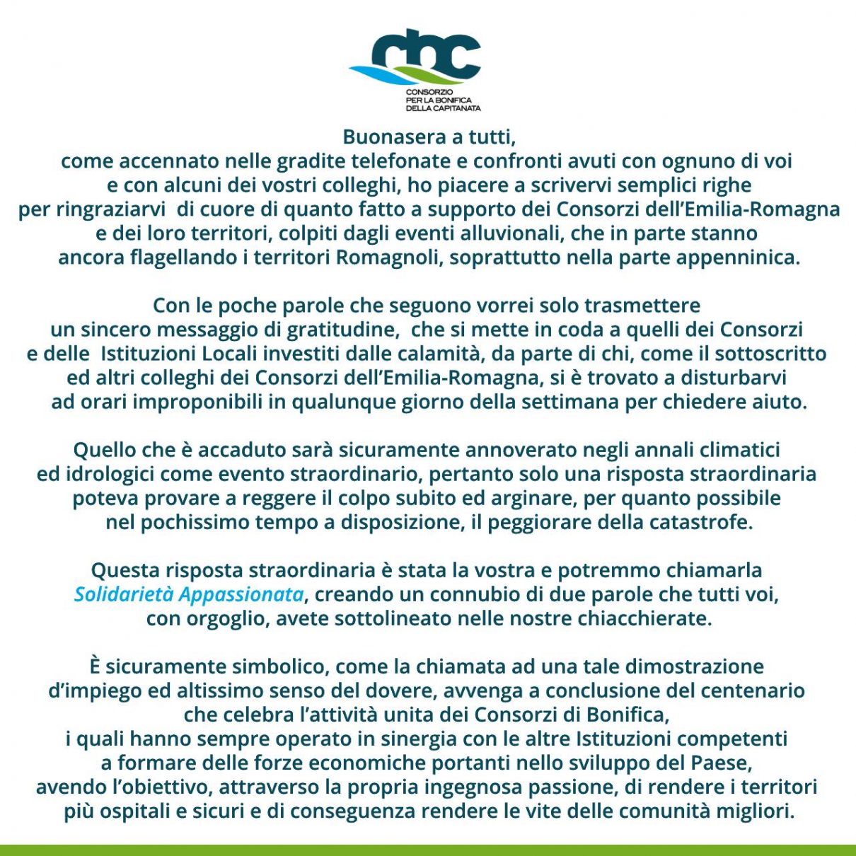 Il Consorzio per la bonifica della Capitanata ha messo a disposizione, dei territori colpiti dagli eventi alluvionali, mezzi e personale. “Ci sembrava doveroso – sottolineano il Presidente Giuseppe De Filippo e il Direttore Generale Francesco Santoro – offrire la nostra disponibilità di aiuto ai consorzi dell’Emilia Romagna chiamati a gestire un evento tanto straordinario quanto