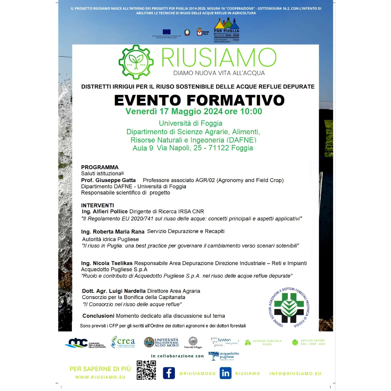 Giorno 17 maggio 20024 presso il Dipartimento di Scienze Agrarie, Alimentari, Risorse Naturali e Ingegneria (DAFNE) dell’Università di Foggia, si terrà un incontro formativo, sul riuso delle acque reflue depurate, nell’ambito del progetto “Distretti irrigui per il riuso sostenibile delle acque reflue depurate: modelli organizzativi e tecnologie innovative” acronimo RIUSIAMO, finanziato dal FEASR nell’ambito del PSR Puglia 2014-2024, in cui il Consorzio per la Bonifica della Capitanata è partner capofila.
