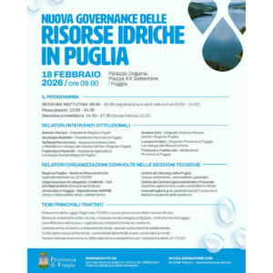 Il Presidente Giuseppe De Filippo parteciperà in qualità di Presidente di ANBI Puglia al convegno “Nuova governance delle risorse idriche” organizzato dalla Provincia di Foggia giorno 18 febbraio p.v. presso Palazzo Dogana.