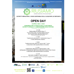 Giorno 10 aprile presso il Distretto Irriguo 11, comprensorio Nord Fortore del Consorzio per la Bonifica della Capitanata, si terrà un incontro nell’ambito del progetto “Distretti irrigui per il riuso sostenibile delle acque reflue depurate: modelli organizzativi e tecnologie innovative” acronimo RIUSIAMO, finanziato dal FEASR nell’ambito del PSR Puglia 2014-2020.