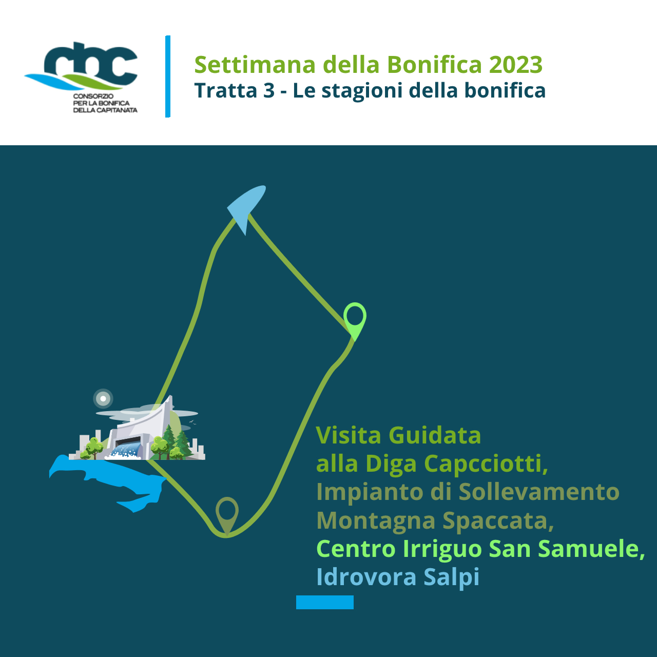 - “LE STAGIONI DELLA BONIFICA”Diga Capacciotti, Impianto di Sollevamento Montagna Spaccata, Centro Irriguo San Samuele ed Idrovora Salpi.