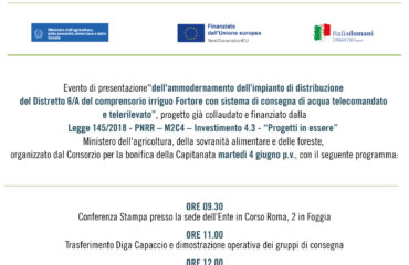 • ANBI PER LE INFRASTRUTTURE DESTINATI OLTRE 160 MILIONI. L’AGRICOLTURA DEL TAVOLIERE VOLTA PAGINA: STANZIATE LE RISORSE ECONOMICHE PER IL COLLEGAMENTO IDRICO MOLISE-PUGLIA