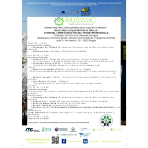 Il Consorzio per la Bonifica della Capitanata ha organizzato mercoledì 19 giugno 2024, presso l’aula 3 del Dipartimento di Scienze Agrarie, Alimenti, Risorse Naturali e Ingegneria (DAFNE) dell’Università di Foggia in Via Napoli n. 25 (Foggia), il convegno “Riuso dell’acqua reflua in Puglia: stato dell’arte e risultati del progetto regionale RIUSIAMO” promosso nell’ambito del progetto RIUSIAMO: Programma di Sviluppo Rurale (PSR) 2014-2020 Puglia sulla Misura 16 “Cooperazione”, sottomisura 16.2 “Sostegno a progetti pilota e allo sviluppo di nuovi prodotti, pratiche, processi e tecnologie”.